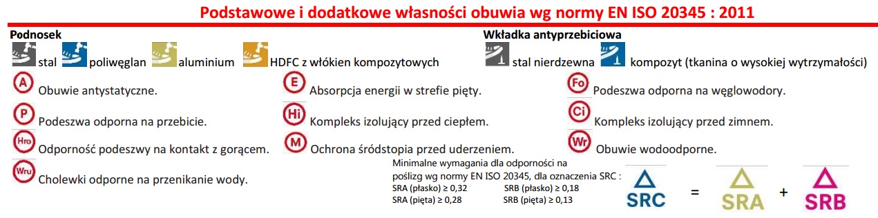 • SB (safety) - posiada cechy ochronne łącznie z ochroną palców stopy za pomocą podnosków, których wytrzymałość jest badana przy uderzeniu z energią 200J.