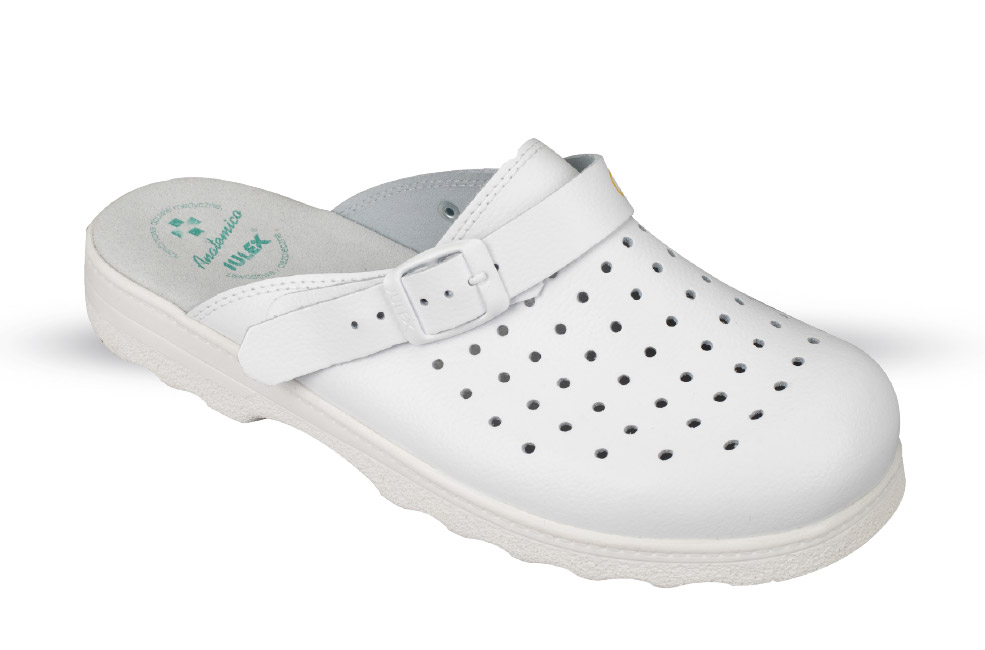 Saboty z naturalnej skóry w kolorze białym. Cholewka wykonana z otworami wentylacyjnymi umożliwiającymi przepuszczalność pary wodnej. Pasek na piętę zapobiega wysuwaniu się stopy. Obuwie występuje w wersji męskiej.